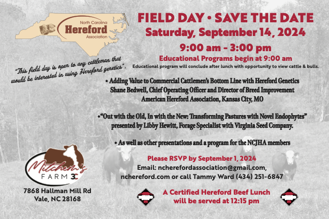 “This field day is open to any cattlemen that would be interested in using Hereford genetics.” Educational program will conclude after lunch with opportunities to view cattle & bulls.